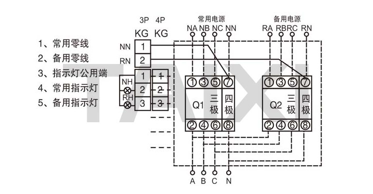 接線時(shí),常用電源N應(yīng)接入常用電源執(zhí)行斷路器QN,備用電源R應(yīng)接入備用電源執(zhí)行斷路器QR。當(dāng)QN和QR為四線斷路器時(shí),接線方式按接線圖,其中QN和QR的1、3、5為三相(A、B、C)進(jìn)線端,2、4、6為三相出線端,7為零線(N)進(jìn)線端,8為零線出線端。若選用斷路器為三極斷路器,則必須將常用電源(N)的零線NN和備用電源(R)的零線NR同時(shí)接到三極專用接零線端子KG上。具體操作見接線圖。雙電源切換開關(guān)自動(dòng)控制器的工作電源取斷路器QN和QR的進(jìn)線端A相和零線N,若選用斷路器為三極斷路器時(shí),必須要接零線NN和NR,該三極專用接線零端子在兩臺(tái)斷路器中間,在自動(dòng)電源切換開關(guān)安裝,接線過程中,切不要把原接在斷路器進(jìn)線端的本機(jī)控制器線忘掉,碰斷或短路等。