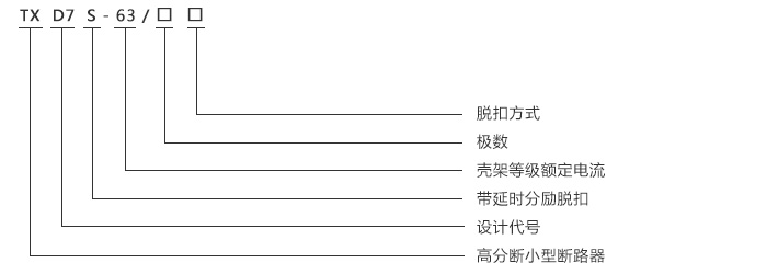 TXD7S-63 帶分勵脫扣器斷路器(預付費電表漏電斷路器/IC卡電表用斷路器),具有智能分勵脫扣器功能,適用于交流50Hz(或60Hz),額定工作電壓為110V-400V,額定電流為63A的線路中,對線路進行遠距離控制分斷或自動信號控制分斷,同時對線路起到過載和短路漏電保護的作用。目前,廣泛應用與IC卡預付費電能表配套使用來控制線路的通斷。斷路器符合GB16917.1、GB10963、GB14048.2標準,具有國際先進水平。二、型號及其規格